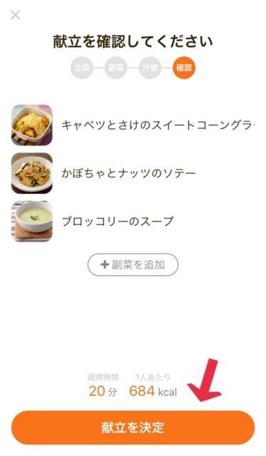 始めに主菜を選ぶとそれに合いそうな副菜、汁物が表示されるのも献立に悩まなくて良い嬉しいポイント。