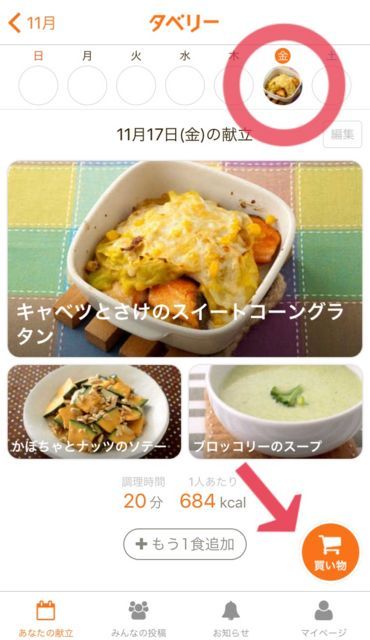 先ほどの「みんなの投稿」画面右下の「+投稿」から、作った献立写真の投稿ができます。