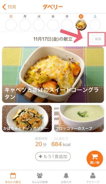 日付を変えたり料理を変えたり、献立自体の削除も可能です。