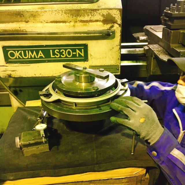 針を蓋の周囲にぐるっとあてて測定器の目盛りが0.01mm以内のふれになるようにブレた部分を更に削ります。