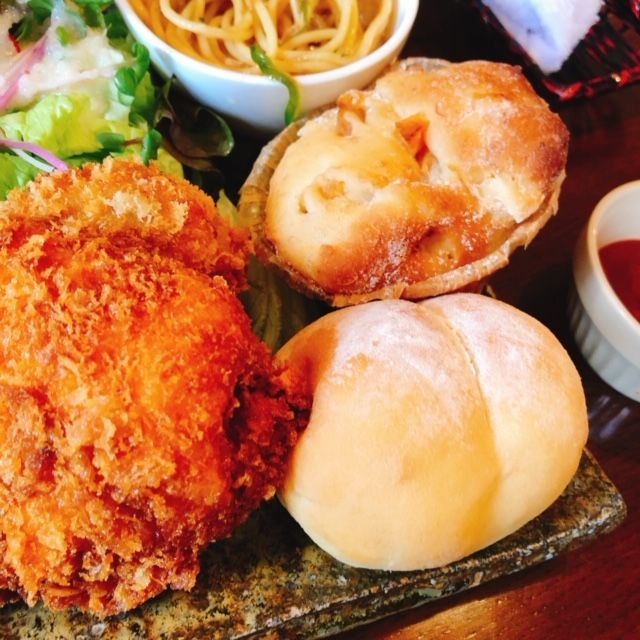 お野菜たっぷりおかずと手作りパン2種が付くお得なセットです。